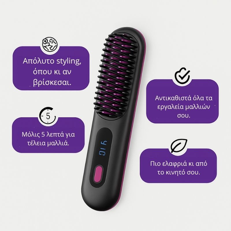 Επαναφορτιζόμενη ηλεκτρική ισιωτική βούρτσα με θερμότητα — για έως και 30 λεπτά γρήγορης χρήσης, όπου κι αν βρίσκεσαι.